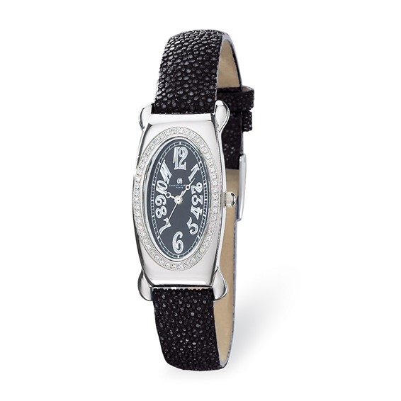 This genuine Charles-Hubert Paris watch includes a gift box and warranty card.Charles Hubert watch model #18312-B/BBlack dial with oversize Arabic numeralsStainless steel case and casebackBlack, genuine stingray leather bandSapphire crystal, 5/8 CT TW diamond accents on bezelRound brilliant diamonds are G-H color, VS clarityChrome handsSwiss ETA movementWater resistance tested to 3 ATMWarranty InformationEach Charles-Hubert Paris watch is backed by a lifetime buckle-to-buckle or lifetime warranty on movement.