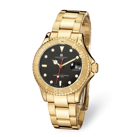 This genuine Charles-Hubert Paris watch includes a gift box and warranty card.Black dial with date0.5 micron 14k yellow gold-plated two-tone stainless steel band, multi-deploy buckleScrew down crown, rotating bezelMineral crystalLuminous hands21 jewel Japanese automatic movementWater resistance tested to 3 ATMWarranty InformationEach Charles-Hubert Paris watch is backed by a lifetime buckle-to-buckle or lifetime warranty on movement.