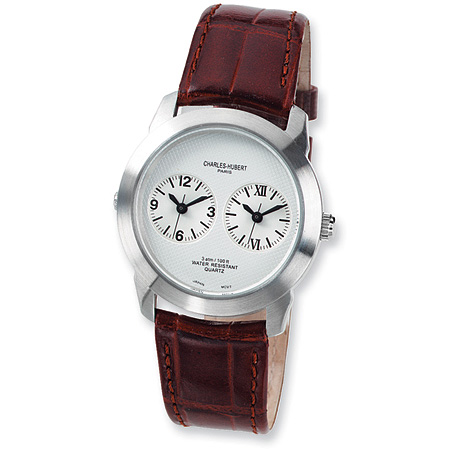 This genuine Charles-Hubert Paris watch has a silver-white dial with dual time. Stainless steel case and casebook. Brown, genuine calf leather band. Charles Hubert watch model #3520-A. includes a gift box and warranty card. Mineral crystalBlack hands, Arabic and Roman numeralsJapanese movementWater resistance tested to 3 ATMWarranty InformationEach Charles-Hubert Paris watch is backed by a lifetime buckle-to-buckle or lifetime warranty on movement.