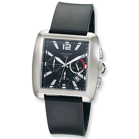 This genuine Charles-Hubert Paris chronograph watch includes a gift box and warranty card.Charles Hubert watch model #3729-BBlack dial with dateStainless steel case and casebackBlack rubber bandMineral crystalChrome hands and markersJapanese movementWater resistance tested to 3 ATMWarranty InformationEach Charles-Hubert Paris watch is backed by a lifetime buckle-to-buckle or lifetime warranty on movement.