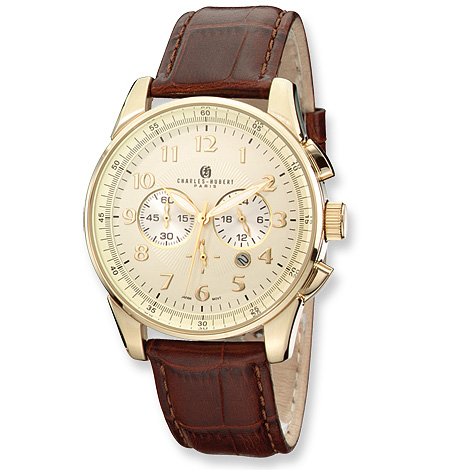 Charles-Hubert Paris chronograph watch has a round gold dial with date. 14k yellow gold-plated 44mm stainless steel case and caseback. Brown calf leather band. Mineral crystal. Luminous hands, Arabic numerals. Japanese movement. Water resistance tested to 3 ATM. Warranty InformationEach Charles-Hubert Paris watch is backed by a lifetime buckle-to-buckle or lifetime warranty on movement. Gift box. Import.