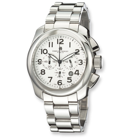 This genuine Charles-Hubert Paris chronograph watch includes a gift box and warranty card.Off-white dial with dateStainless steel case, caseback and bandMineral crystalBlack hands and Arabic numeralsJapanese movementWater resistance tested to 3 ATMWarranty InformationEach Charles-Hubert Paris watch is backed by a lifetime buckle-to-buckle or lifetime warranty on movement.
