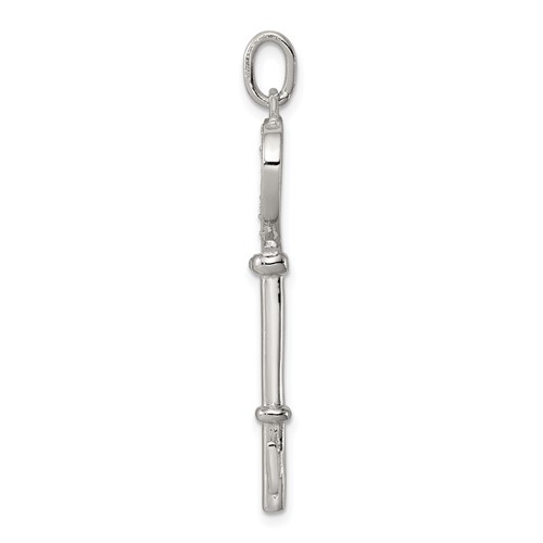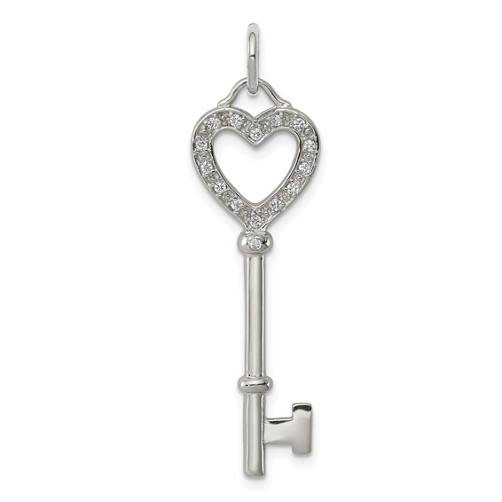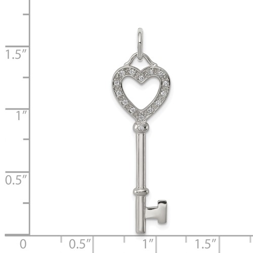 Polished, sterling silver key pendant weighs approximately 1.88 grams. Dimensions: 3/8in x 1 1/4in without bail. Round brilliant cubic zirconias. Fits up to a 3mm wide chain.
