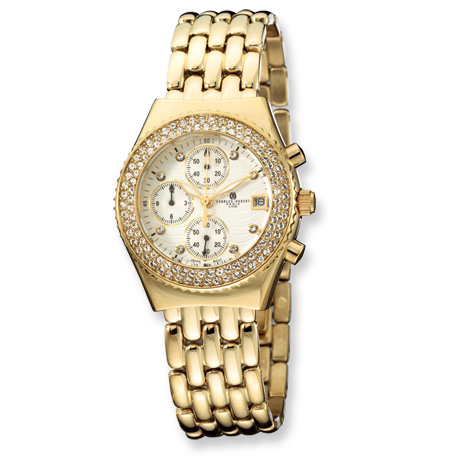 This genuine Charles-Hubert Paris chronograph watch includes a gift box and warranty card.Silver-white dial with date0.5 micron 14k yellow gold-plated stainless steel case, caseback and bandMineral crystalGold-tone handsSwarovski® crystals on bezel and markersJapanese quartz movementWater resistance tested to 3 ATMWarranty InformationEach Charles-Hubert Paris watch is backed by a lifetime buckle-to-buckle or lifetime warranty on movement.