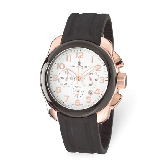 This genuine Charles-Hubert Paris chronograph watch includes a gift box and warranty card.White ceramic dial with date0.5 micron 14k rose gold-plated stainless steel case and casebackBlack rubber bandMineral crystalRose gold-tone hands, Arabic numeralsJapanese quartz movementWater resistance tested to 3 ATMWarranty InformationEach Charles-Hubert Paris watch is backed by a lifetime buckle-to-buckle or lifetime warranty on movement.