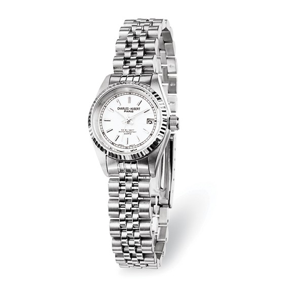This genuine Charles-Hubert Paris watch includes a gift box and warranty card.Off-white dial with dateStainless steel case, caseback and bandMineral crystalScrewdown crown, screwbackChrome hands and markersJapanese movementWater resistance tested to 5 ATMWarranty InformationEach Charles-Hubert Paris watch is backed by a lifetime buckle-to-buckle or lifetime warranty on movement.
