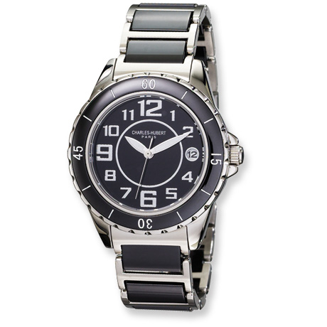 This men's Charles-Hubert Paris ceramic watch includes a gift box and warranty card. Black ceramic dial with date. Stainless steel case and casebackGenuine ceramic and stainless steel band, ceramic bezelMineral crystalChrome hands and markersJapanese movementWater resistance tested to 5 ATMWarranty InformationEach Charles-Hubert Paris watch is backed by a lifetime buckle-to-buckle or lifetime warranty on movement.