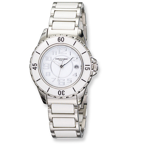 This genuine men's Charles-Hubert Paris ceramic watch includes a gift box and warranty card.White ceramic dial with date40mm stainless steel case and casebackGenuine ceramic and stainless steel band, ceramic bezelMineral crystalChrome hands and markersJapanese movementWater resistance tested to 5 ATMWarranty InformationEach Charles-Hubert Paris watch is backed by a lifetime buckle-to-buckle or lifetime warranty on movement.