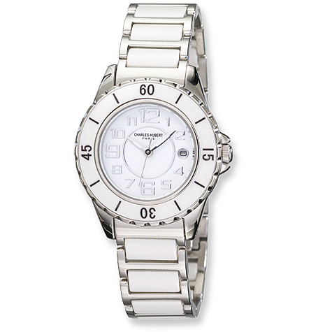 This genuine ladies' Charles-Hubert Paris ceramic watch includes a gift box and warranty card.White ceramic dial with date30mm stainless steel case and casebackGenuine ceramic and stainless steel band, ceramic bezelMineral crystalChrome hands and markersJapanese movementWater resistance tested to 5 ATMWarranty InformationEach Charles-Hubert Paris watch is backed by a lifetime buckle-to-buckle or lifetime warranty on movement.