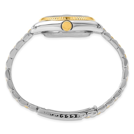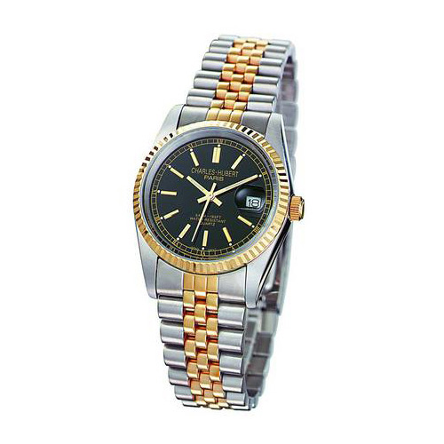 This genuine men's Charles-Hubert Paris watch has a round black dial with date. 0.5 micron 14k yellow gold-plated two-tone stainless steel case and band. 35mm case. Stainless steel caseback. Mineral crystal. Screwdown crown, screwback. Gold-tone hands and markers. Japanese movement. Water resistance tested to 5 ATM. Includes a gift box.Warranty InformationEach Charles-Hubert Paris watch is backed by a lifetime buckle-to-buckle or lifetime warranty on movement.