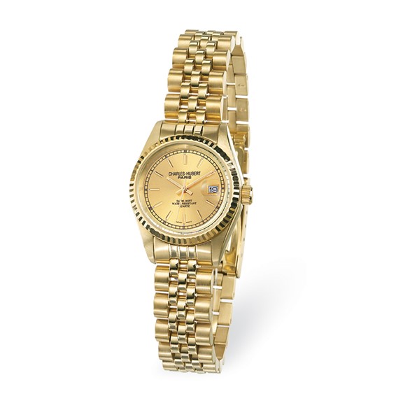 This genuine ladies' Charles-Hubert Paris watch includes a gift box and warranty card.Champagne dial with date0.5 micron 14k yellow gold-plated stainless steel case and band. 28mm case. Stainless steel casebackMineral crystalScrewdown crown, screwbackGold-tone hands and markersJapanese movementWater resistance tested to 5 ATMWarranty InformationEach Charles-Hubert Paris watch is backed by a lifetime buckle-to-buckle or lifetime warranty on movement.