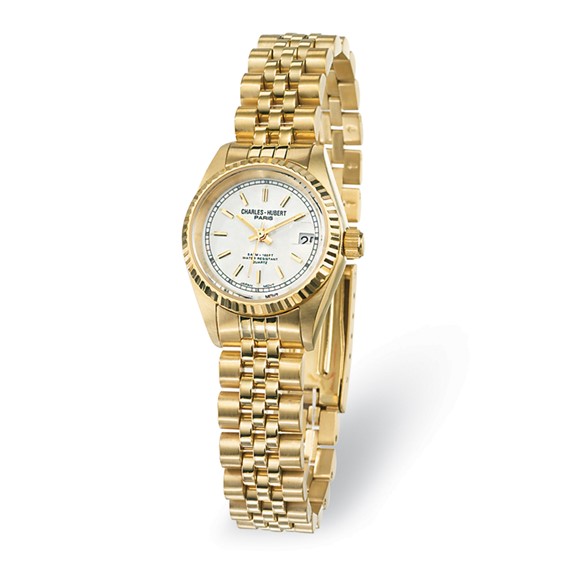 This genuine ladies' Charles-Hubert Paris watch includes a gift box and warranty card.Off-white dial with date0.5 micron 14k yellow gold-plated stainless steel 26mm caseStainless steel casebackMineral crystalScrewdown crown, screwbackGold-tone hands and markersJapanese movementWater resistance tested to 5 ATMWarranty InformationEach Charles-Hubert Paris watch is backed by a lifetime buckle-to-buckle or lifetime warranty on movement.