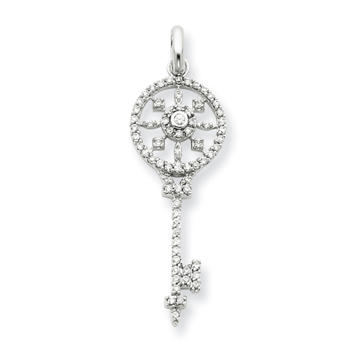 This dazzling key pendant is encrusted with round brilliant cubic zirconias. Item weighs approximately 3.07 grams. Chain not included. Dimensions: 5/8in x 1 1/2in.