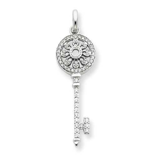 Sterling silver key pendant has a petal design and is decorated with cubic zirconia accents. Dimensions: 1/2in x 1 1/2in. This item weighs approximately 3.02 grams. Chain not included. Import. Available while supplies last.