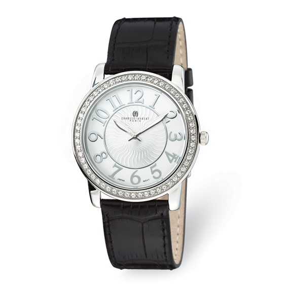 This genuine Charles-Hubert Paris watch includes a gift box and warranty card.Off-white dialStainless steel case and casebackGenuine black calf leather bandMineral crystalSwarovski® crystals on bezelSilver-tone hands; Arabic numeralsJapanese quartz movementWater resistance tested to 3 ATMWarranty InformationEach Charles-Hubert Paris watch is backed by a lifetime buckle-to-buckle or lifetime warranty on movement.