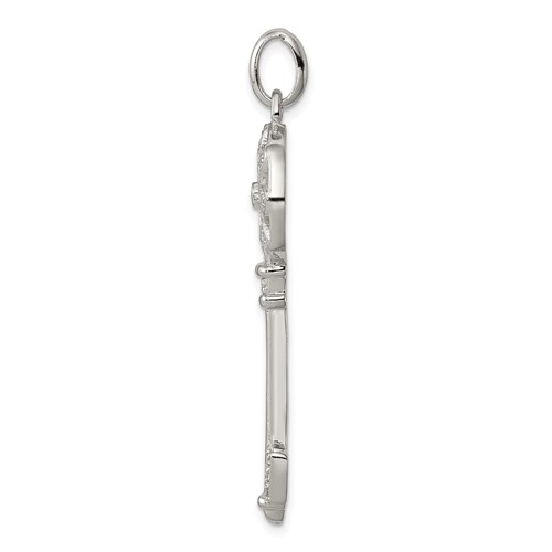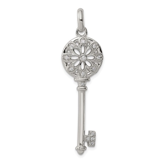 Sterling silver key pendant has a floral design is decorated with round brilliant cubic zirconias. Item size: 1/2in x 1 5/8in. Item weighs approximately 3.68 grams. Chain not included.