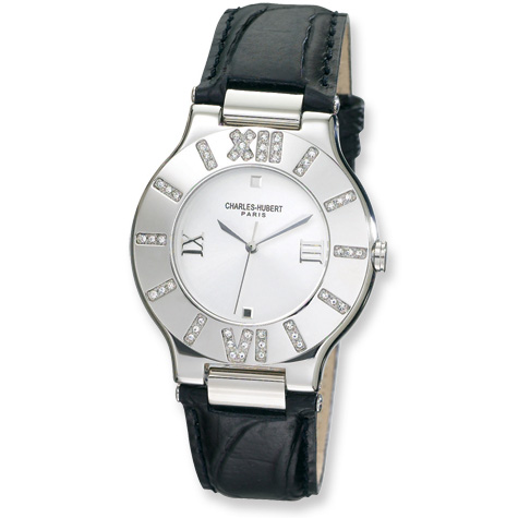 This genuine Charles-Hubert Paris watch includes a gift box and warranty card.Charles Hubert watch model #3749-LWhite dialStainless steel case and casebackGenuine black calf leather bandMineral crystalChrome hands and markers; Roman numeralsSwarovski® crystals form Roman numerals on bezelJapanese movementWater resistance tested to 3 ATMWarranty InformationEach Charles-Hubert Paris watch is backed by a lifetime buckle-to-buckle or lifetime warranty on movement.