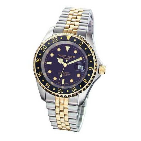 This genuine men's Charles-Hubert Paris watch has a round black dial with unidirectional bezel. Charles Hubert watch model #3663. Includes a gift box and warranty card. Black dial with date40mm two-tone brass case and bandStainless steel caseback, multi-deploy buckleMineral crystalRotating diver bezel, screw down crown, screwbackLuminous hands and markersJapanese movementWater resistance tested to 3 ATMWarranty InformationEach Charles-Hubert Paris watch is backed by a lifetime buckle-to-buckle or lifetime warranty on movement.