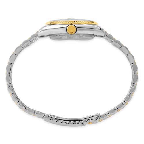 Charles Hubert Paris watch model #3401 has an indigo blue dial with day and date. 0.5 microns 14k yellow gold-plated two-tone brass case and band. Stainless steel caseback, multi-deploy buckle. Case size: 36mm. Mineral crystal, gold-tone hands and markers. Japanese movement. Water resistance tested to 3 ATM. This genuine men's Charles-Hubert Paris watch includes a gift box and warranty card. Warranty InformationEach Charles-Hubert Paris watch is backed by a lifetime buckle-to-buckle or lifetime warranty on movement.