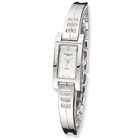 This genuine ladies' Charles-Hubert Paris watch includes a gift box and warranty card.Silver-white dial with dateChrome finish brass case, caseback and bandMineral crystal, Swarovski® crystals on bandSilver-tone hands and markers, Arabic numeralsJapanese movementWater resistance tested to 3 ATMWarranty InformationEach Charles-Hubert Paris watch is backed by a lifetime buckle-to-buckle or lifetime warranty on movement.