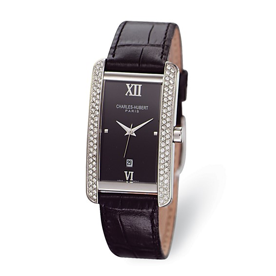 This genuine men's Charles-Hubert Paris watch includes a gift box and warranty card.Charles Hubert watch model #3669-B/BBlack dial with dateStainless steel case and casebackGenuine calf leather bandMineral crystalSwarovski® crystals on bezelChrome handsJapanese movementWater resistance tested to 3 ATMWarranty InformationEach Charles-Hubert Paris watch is backed by a lifetime buckle-to-buckle or lifetime warranty on movement.