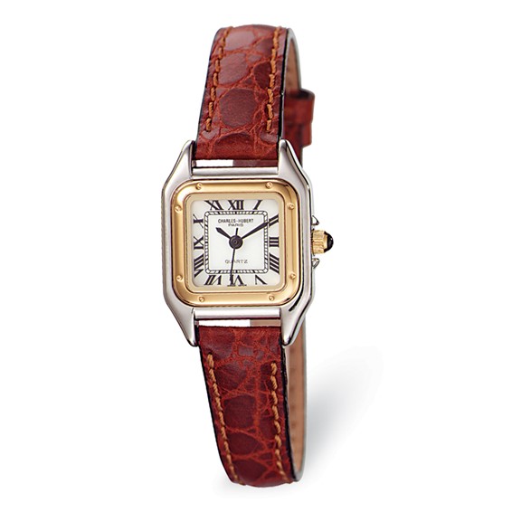 This genuine ladies' Charles-Hubert Paris watch includes a gift box and warranty card. Case size: 24mm. Band width: 14mm. Charles Hubert watch model #6437. 0.5 microns 14k yellow gold-plated two-tone brass case. Stainless steel caseback. Genuine calf leather band. Mineral crystal. White square dial with black hands and Roman numerals. Japanese movement. Water resistance tested to 3 ATM.Warranty InformationEach Charles-Hubert Paris watch is backed by a lifetime buckle-to-buckle or lifetime warranty on movement.