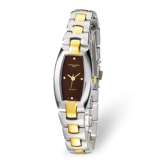 This genuine ladies' Charles-Hubert Paris watch includes a gift box and warranty card. Sunray brown black dial. 0.5 microns 14k yellow gold-plated two tone stainless steel case and band. Case size: 19mm x 31mm. Stainless steel caseback and deployment buckle. Mineral crystal. Gold-tone hands and markers. Japanese Quartz movement. Water resistance tested to 3 ATM. Each Charles-Hubert Paris watch is backed by a lifetime buckle-to-buckle or lifetime warranty on movement.