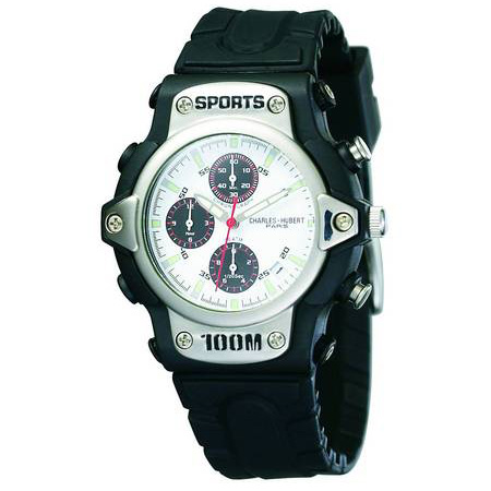 This genuine men's Charles-Hubert Paris chronograph watch includes a gift box and warranty card.Charles Hubert watch model #3525-WWhite dial with day and dateFiberglass case, stainless steel caseback, rubber watch bandMineral crystalLuminous hands and markersJapanese movementWater resistance tested to 10 ATMWarranty InformationEach Charles-Hubert Paris watch is backed by a lifetime buckle-to-buckle or lifetime warranty on movement.