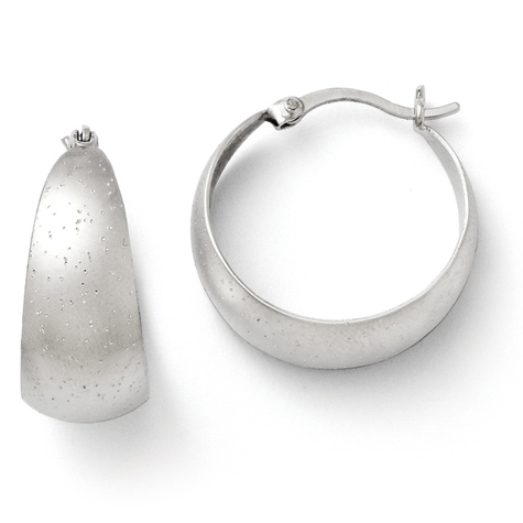The surface of these Radiant Essence hoop earrings sparkles with shimmering points. Tapered hoop earrings are made of sterling silver with rhodium plating. Approximate dimensions: 1in x 7/8in. Approximate item weight: 5.3 grams. Imported.