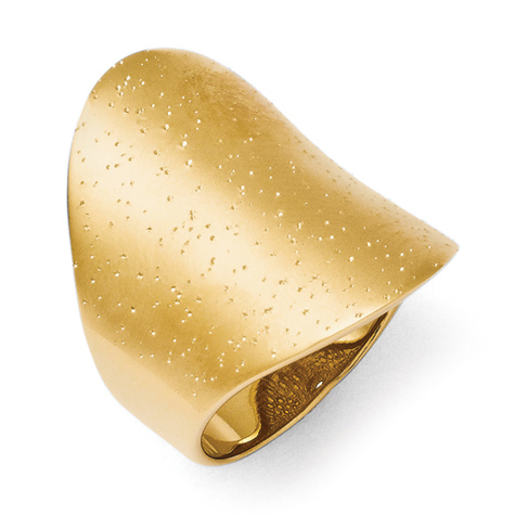 The surface of this ladies' Radiant Essence ring sparkles with shimmering points. Ring is made of solid, polished sterling silver with 14kt yellow gold plating. Standard fit. Available in whole sizes only, 6-8. Approximate item weight: 9.9 grams. Imported.