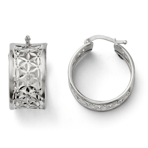These hoop earrings are composed of solid, polished sterling silver. Diamd-cut floral earrings are made in Italy. Approximate dimensions: 3/4in x 11.5mm. Approximate item weight: 4.46 grams. Pair with matching bangle bracelet QLF102 and necklace QLF107.