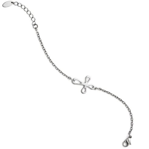 Stainless steel sideways cross bracelet is 6 1/2in long and features a 1 1 1/2in extension. Fancy lobster clasp. Weight: 3.0 grams. Imported.
