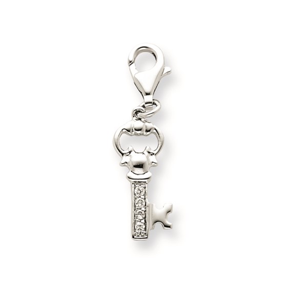 Item weighs approximately 2.09 grams. Polished, sterling silver key pendant is the size of a penny. Dimensions: 5/16in x 3/4in. Chain not included.