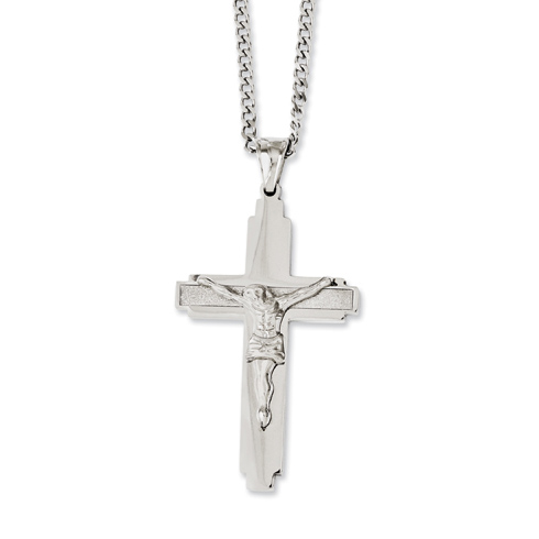 Polished, laser cut crucifix necklace is made of stainless steel. The crucifix dangles from a 22in steel curb chain with fancy lobster clasp. Pendant dimensions: 2in x 1 1/4in. Weight: 20.0 grams. Imported.