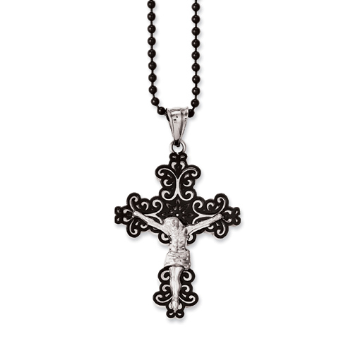 Crucifix necklace is made of black ion-plated stainless steel. This fancy crucifix dangles from a 22in black ion-plated steel bead chain with fancy lobster clasp. Pendant dimensions: 1 1/2in x 1in. Weight: 16.1 grams. Imported.