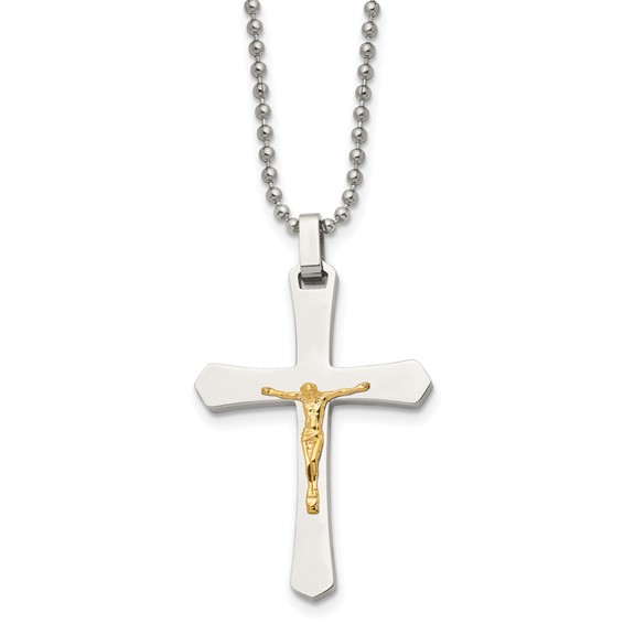 14k yellow gold accented crucifix necklace is made of 316L stainless steel. The crucifix includes a 22in steel bead chain with fancy lobster clasp. Pendant dimensions: 1 1/2in x 1 1/8in. Weight: 10.4 grams. Imported.