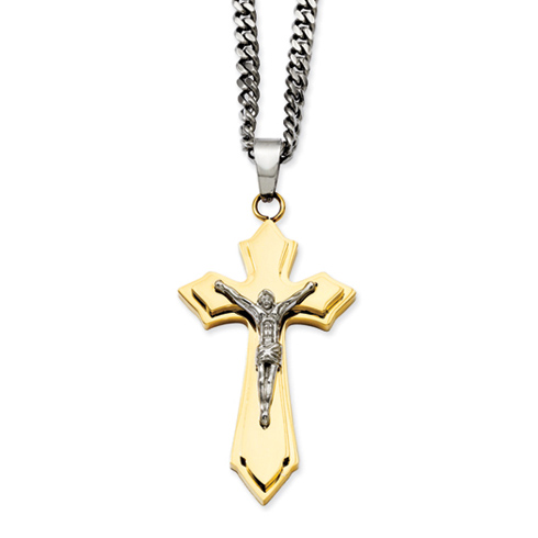 Pointed gold-plated crucifix necklace is made of 316L stainless steel. The crucifix dangles from a 24in steel curb chain with fancy lobster clasp. Pendant dimensions: 2in x 1 1/4in. Weight: 20.3 grams. Imported.