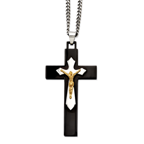 Jumbo black and gold-plated crucifix necklace is made of 316L stainless steel. The crucifix dangles from a 24in steel curb chain with fancy lobster clasp. Pendant dimensions: 3in x 1 3/4in. Weight: 39.3 grams. Imported.