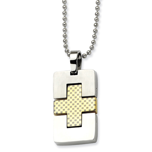 Yellow gold-plated dog tag cross necklace is made of 316L stainless steel. The pendant dangles from a 24in steel bead chain with fancy lobster clasp. Pendant dimensions: 1 1/8in x 5/8in. Weight: 21.5 grams. Imported. Available while supplies last.
