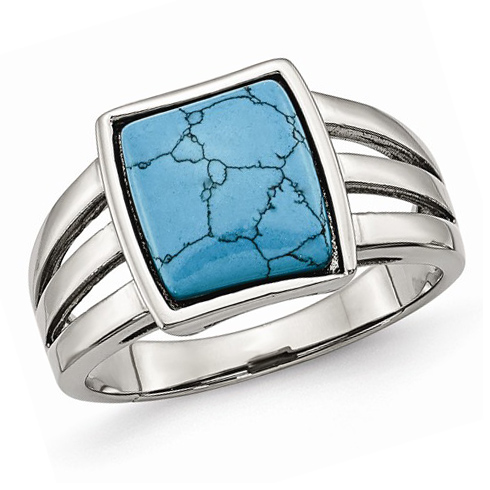 Ladies' stainless steel ring features an imitation turquoise stone. Polished finish. Ring top width: 9mm. Standard fit. Weight: 2.75 grams. Imported.