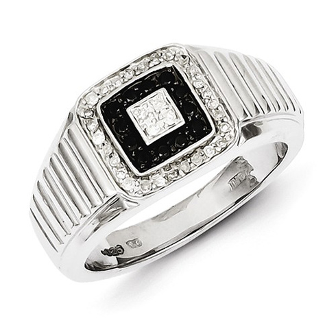 Men's sterling silver square 3/8 ct tw black and white diamond ring has a stepped textured finish. Standard fit. Ring top width: 12mm, palm width: 4mm. Weight: 7 grams. Gift boxed. Import.