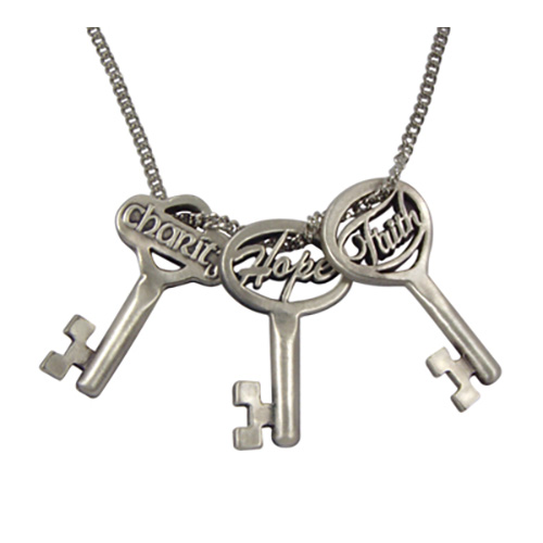Learn more about this item: Polished mixed metal, silver finish Get all 3 keys: Faith, Hope and Charity Free 18-inch curb chain Imported Guaranteed to be free of defects for the life of the item What is mixed metal?Mixed metal is also known as Jewelers metal. It involves various combinations of brass, copper, tin, bronze. There is no lead and it generally is nickel free.