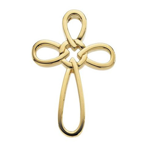 This loop cross pendant is made of polished solid 14k yellow gold. Dimensions: 34.25mm x 24mm. This item is larger than a quarter. Hidden bail fits up to a 2mm wide chain. Approximate weight: 5.6 grams.