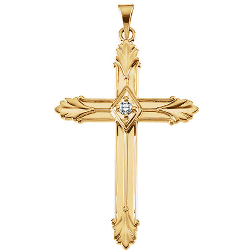 This .06 ct diamond accent budded cross is made of polished 14k yellow gold. Item size: 1 1/2in x 1in. This item is larger than a half dollar. Diamond details: .06 ct, round brilliant, G-H color, SI1 clarity. Weight: 2.8 grams.