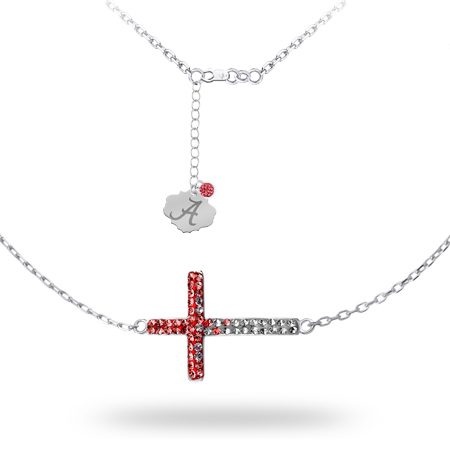 University of Alabama crystal cross necklace features red and white Austrian crystals. Sterling silver 18in diamond cut cable chain with lobster clasp. Cross pendant dimensions: 31.7mm x 19.5mm.