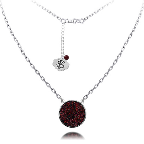 Florida State University crystal disc necklace features garnet Austrian crystals. Sterling silver 18in diamond cut cable chain with lobster clasp. Disc pendant dimensions: 10mm x 10mm, half the size of a nickel. Officially licensed.