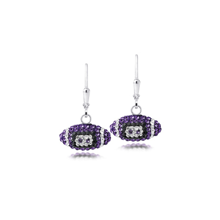 Sterling silver Louisiana State University crystal football dangle earrings feature purple, black, and white Austrian crystals. Football dimensions: 17mm, slightly smaller than a dime. Officially licensed.