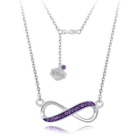 Louisiana State University crystal infinity necklace features purple and white Austrian crystals. Sterling silver 18in diamond cut cable chain with lobster clasp. Infinity pendant dimensions: 28.5mm x 10mm, slightly wider than a quarter. Officially licensed.