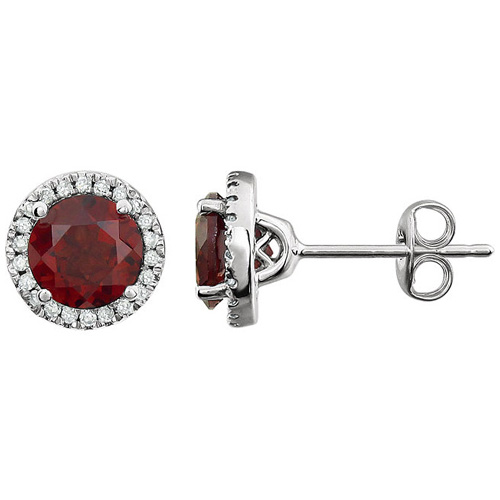 Round garnet and diamond earrings are set in polished 14kt white gold. Gemstone details: two 6mm round genuine Mozambique garnet, AA quality, dark orange red. Each garnet weighs 1 carat. 1/8 ct tw genuine diamond accents. Weight: 1.4 grams. Please note: weight is approximate, actual weight may vary.