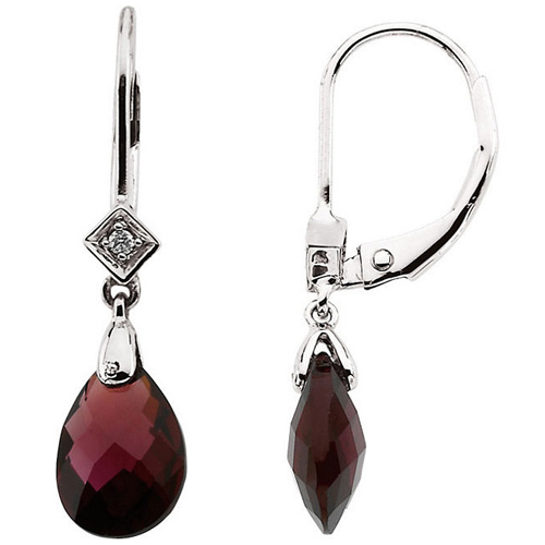 10mm x 7mm Brazilian garnet briolette earrings are set in polished 14kt white gold with diamond accents. Gemstone details: genuine Mozambique garnet, AA quality, dark orange red, 10mm x 7mm, 5.0 carat total weight. Weight: 1.5 grams. Please note: weight is approximate, actual weight may vary.